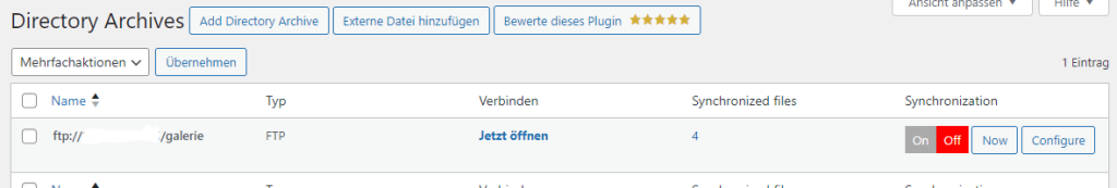 - Gehe dann im WordPress-Backend auf Medien > Verzeichnisarchive und klicke dort bei deiner Verbindung auf „Jetzt“.